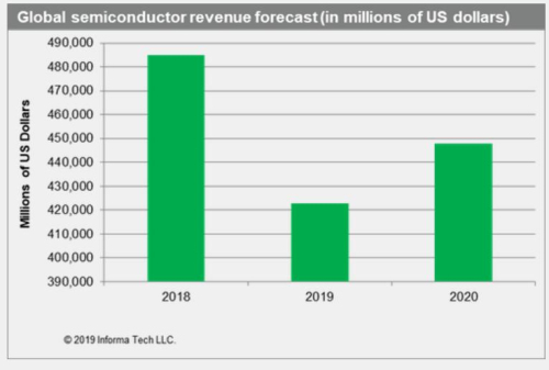 IHS Markit預(yù)計(jì),2020年全球半導(dǎo)體市場(chǎng)收入將出現(xiàn)反彈,從2019年的4228億美元增至4480億美元,增幅會(huì)達(dá)到5.9%。這可能會(huì)讓英特爾、三星、臺(tái)積電、高通、Broadcom等全球頂尖半導(dǎo)體公司松一口氣。